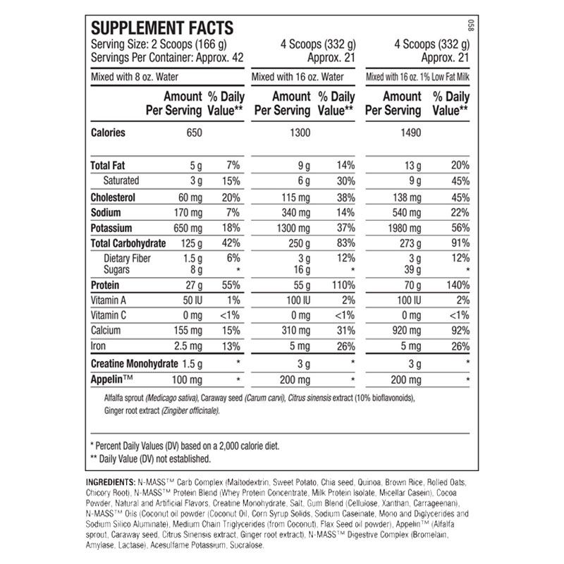 🎯 THÀNH PHẦN VÀ CÔNG DỤNG CỦA SẢN PHẨM ANS MASS - Creatine tăng cường sức mạnh & BCAA’S tự nhiên bên trong để tăng kích thước và sức mạnh! - Phức hợp hỗ trợ tiêu hóa tự nhiên để đảm bảo bạn luôn thèm ăn. - Carbs có nguồn gốc từ thực phẩm chứa: khoai lang, hạt chia, hạt quinoa và yến mạch cuộn. N-MASS cung cấp 1300 calo chất lượng lớn trong mỗi khẩu phần ăn! Với 55g protein toàn phần có nguồn gốc tự nhiên, 3g creatine tăng cường sức mạnh và 250g carbs từ thực phẩm cho một công thức toàn phần vượt trội để xây dựng cơ bắp chất lượng cao. - Calories 650, Toatl Fat 5 g, Cholesterol 60 mg, Sodium 170 mg, Potassium 650 mg, Total Carbohydrate 125 g, Protein 27 g, Creatine Monohydrate 1.5 g, Appelin 100 mg