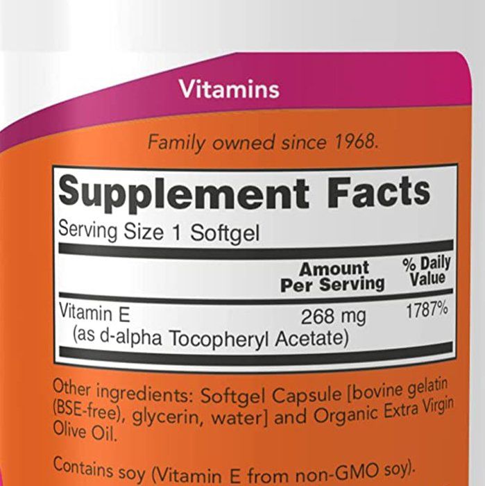 Mỗi khẩu phần Now Vitamin 400IU (tương đương 1 viên)chứa 400IU (268mg) vitamin E.