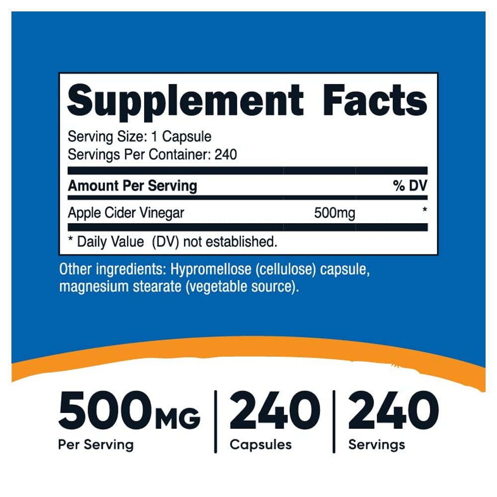 NUTRICOST APPLE CIDER VINEGAR hộp 240 viên tương ứng với 240 lần sử dụng.